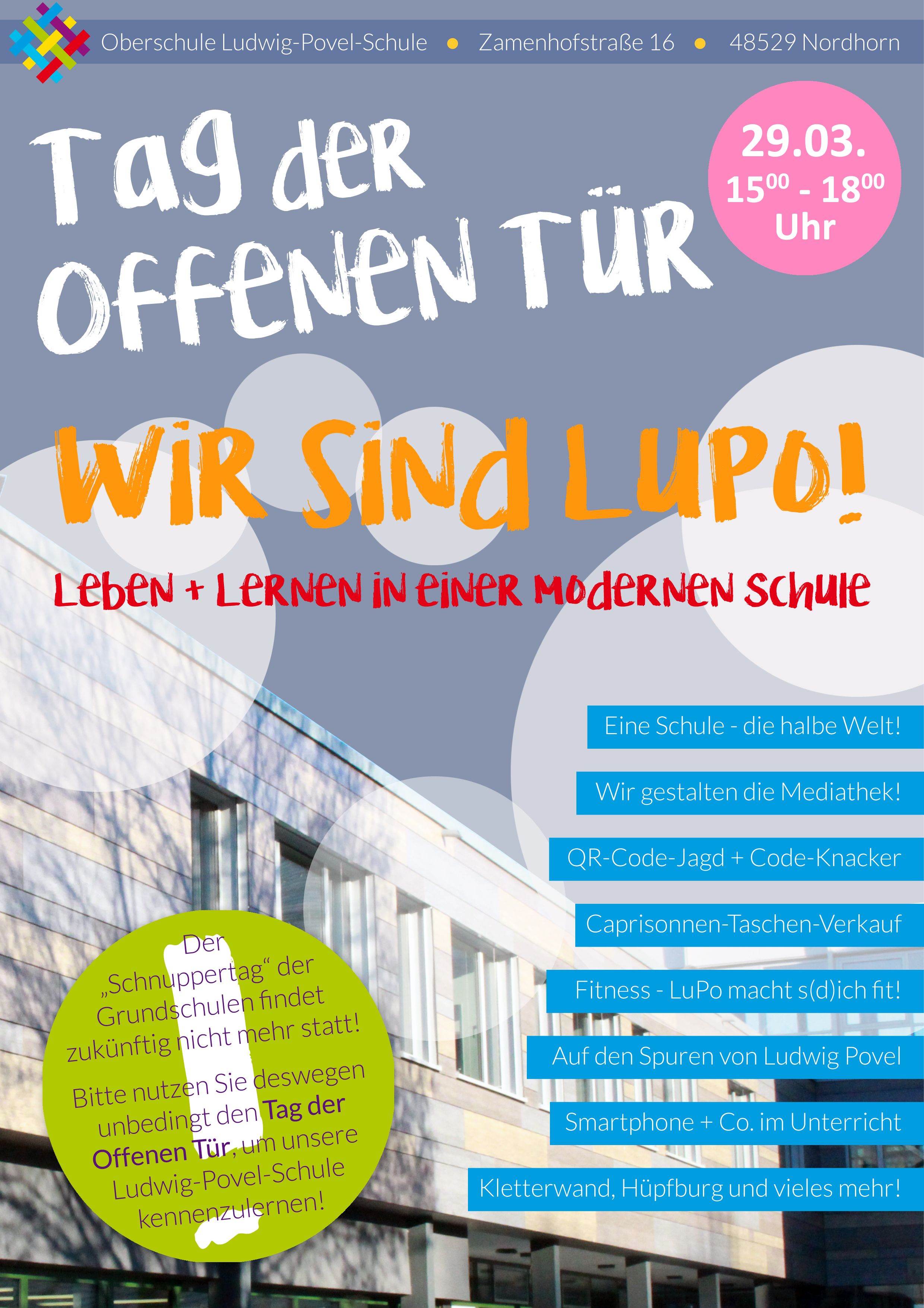 Flyer tag der offenen tür schule. Künftigen schülern die möglichkeit direkt mit der schule in kontakt zu treten. Sollten sie eine individuelle beratung wünschen nehmen sie kontakt mit uns auf. Unsere pädagogische arbeit auf einen blick.